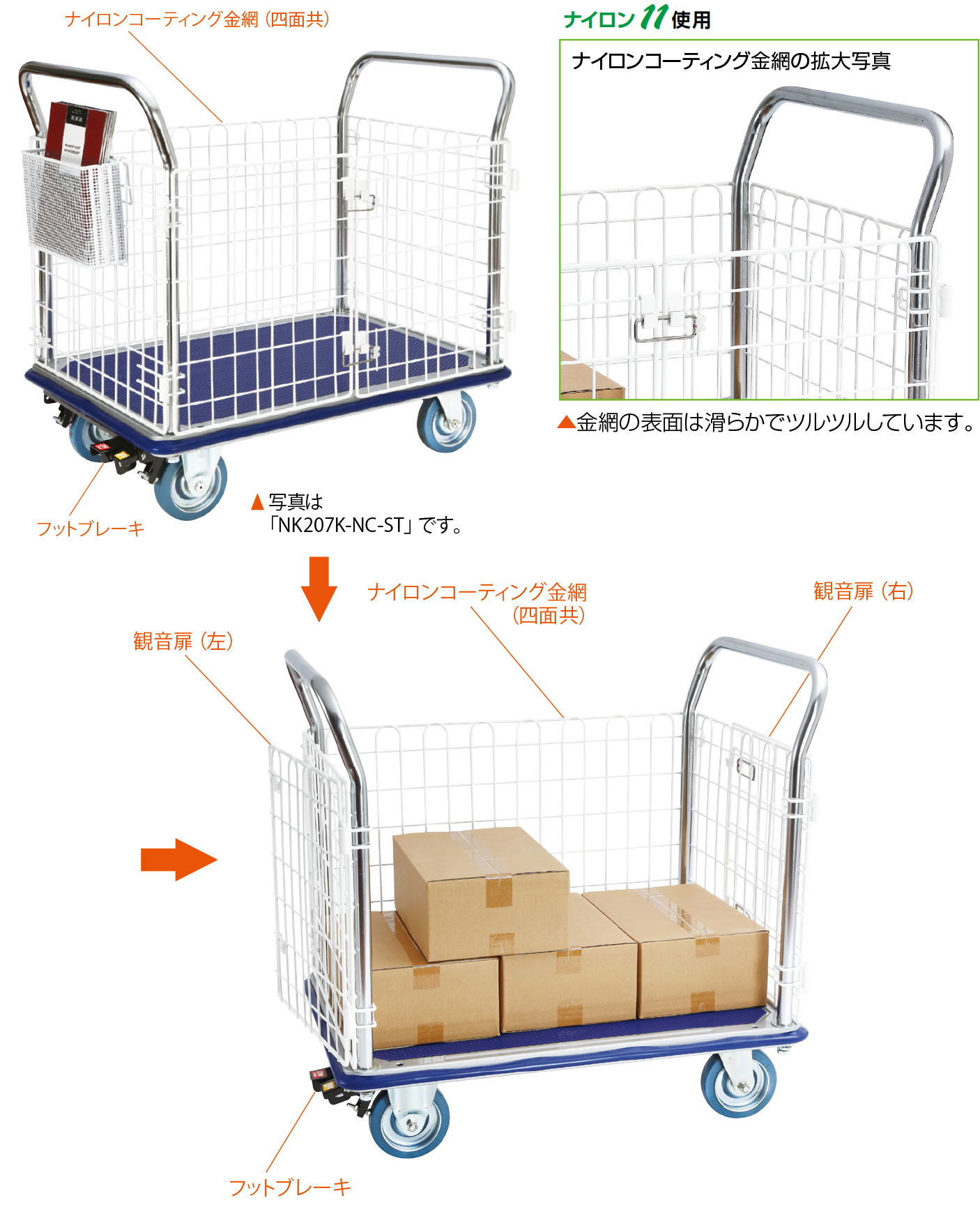 ナイロンコート金網は、内も外も非常に滑らかで、耐傷つき性が高く、傷つき易いデリケートな積載物の運搬にも最適です。